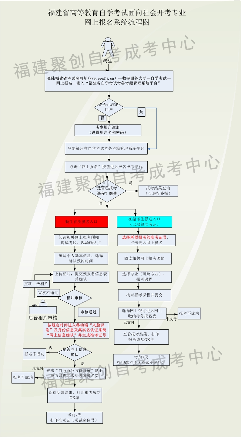 主考院校网上导入新生数据—新生本人完善基本信息并上传照片—现场信息确认(生成准考证号)—网上报考课程并缴费