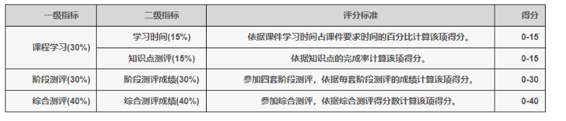 课程学习占25%,阶段测评占30%,综合测评占30%,学习表现占15%这几部分组成。
